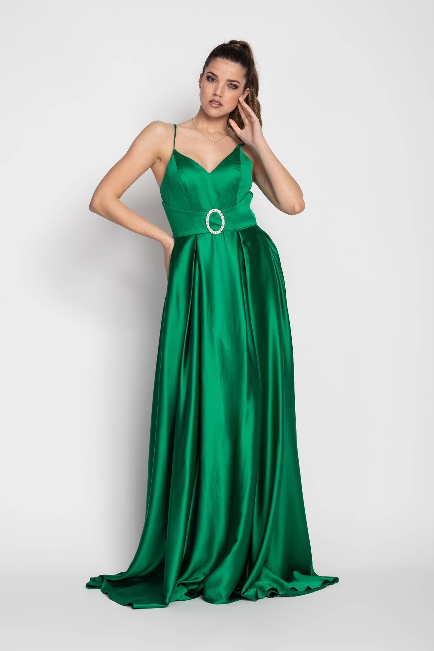 Glamour Long Dress with Pleats and Rhinestone Belt